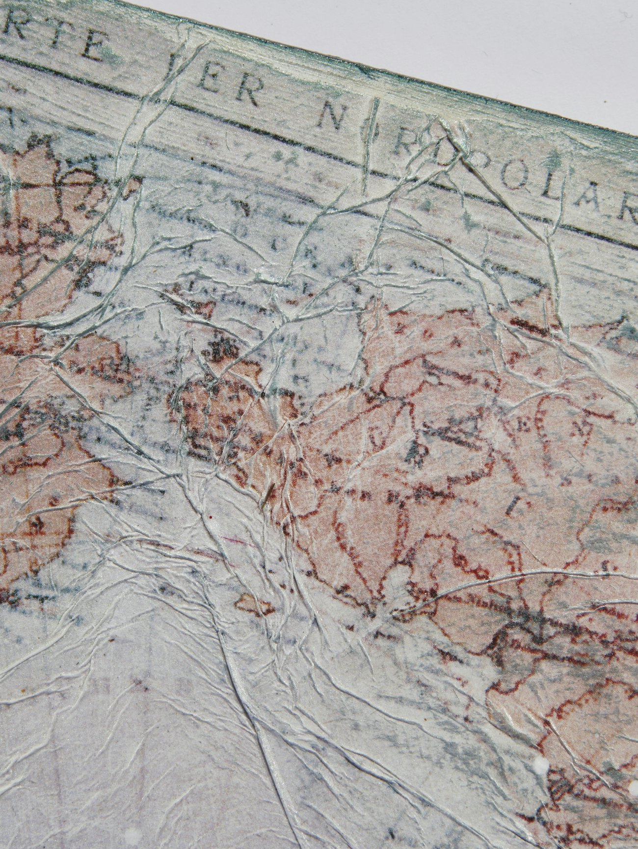 Bertil Vallien's classic head in “Vallien blue”. The head is larger than in previous editions, in almost “natural” size. Molded in the hotshop, sanded, blasted and polished. Mounted on background with map image for hanging on wall.