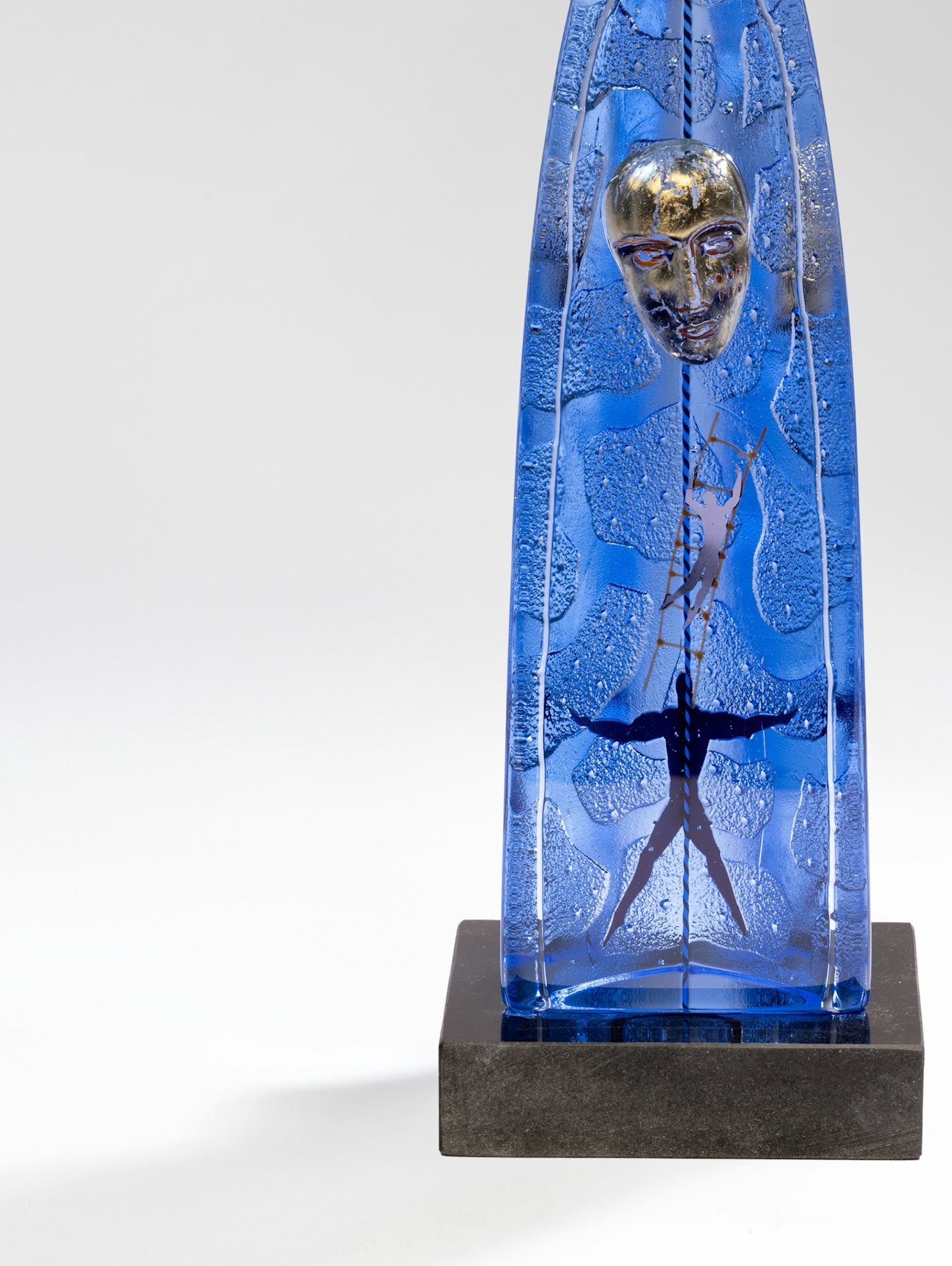 Bertil Vallien's classic vertical vessel Open Arms in "Vallien blue" with a hand painted head in gold, is made at Kosta Glassworks in an edition of 300 pieces, signed by the artist. Open Arms stands proudly on a black stone base.